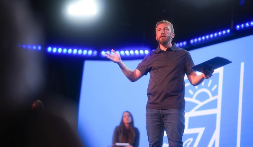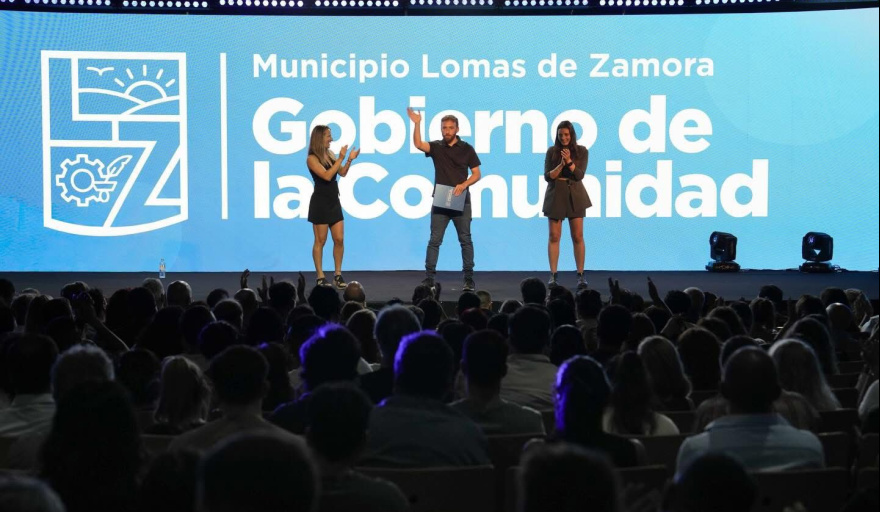 El intendente de Lomas de Zamora, Federico Otermín, junto a la jefa de gabinete del Municipio, Sol Tischik, y la secretaria general, Aldana Scillama, presentó en el Teatro local Gobierno de la Comunidad 2026, una propuesta de 26 ejes que definen la gestión este año.
